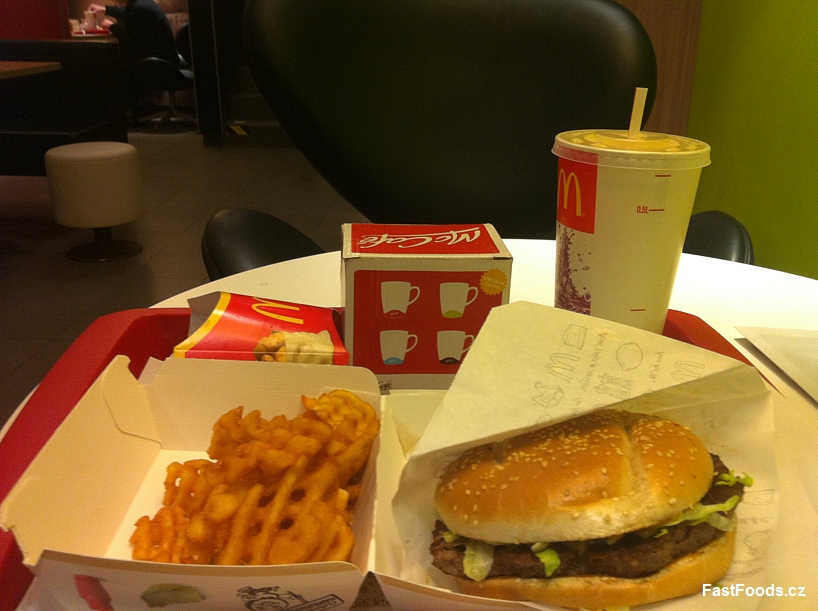 Objednal jsem si již zmíněný Burger menu 1955 s mřížkami a džusem. Připadá mi, že je ten burger od uvedení stále menší a menší? Burger chuťově nezklamal, všechny ingredience byly čerstvé. Mřížky křupavoučké a ideálně nasolené. Problém nastal u džusu, který mi tentokrát přišel dost naředěný. K menu navíc v těchto dnech dostanete i krásný McCafé hrníček a oproti minulé akci s hrnky McCafé jsou tyto i s uchem ;)