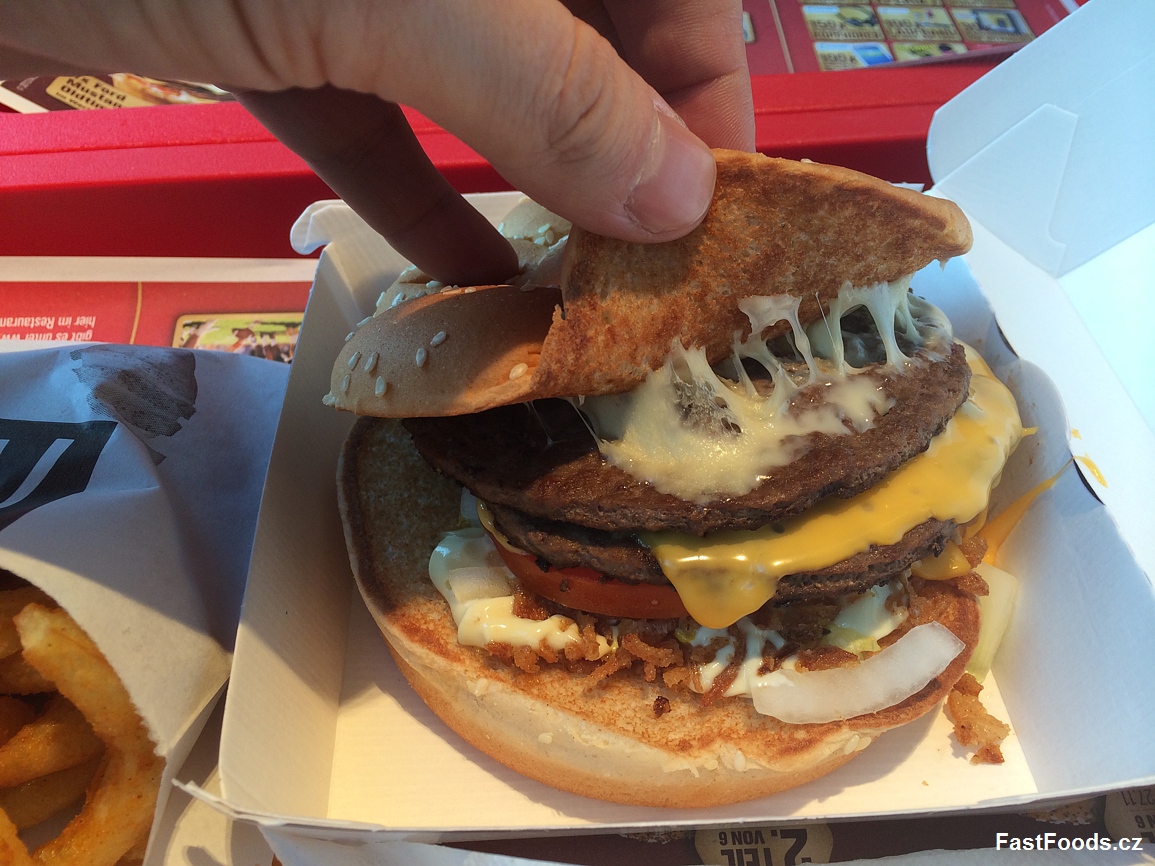 Ve frontě jsem si vybral z místní sezonní nabídky USA Burgerů. Bohužel můj vybraný burger byl v minulém týdnu. Objednal jsem si tedy sýrový Cheese Beef burger se spirály a Coca-Colou. Kečup jsem dostal automaticky a zdarma.