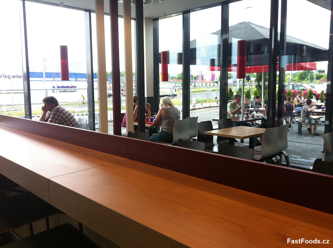 Restaurace disponuje jak už jsem zmínil zahrádkou, na které je umístěno několik stolů. Dále nabízí KFC drive-thru výdej jídla do auta. Na tom by celkem nic nebylo, ale řešení vjezdu a výjezdu je absurdní. Při sjezdu z výpadovky objedete celou restauraci a dostanete se k okénku, objednáte, dostanete jídlo a chcete vyjet zpět na výpadovku, ale ejhle není možnost vyjet. Znovu musíte objet celou restauraci a až u vjezdu do drive-thru lze odbočit na sousedící silnici, která vás už vyvede zpět na výpadovku. Přijde mi, že někdo při projektování restaurace udělal chybku. Další problém je neznačený přechod přes výjezd z Drive-thru, kdy vás klidně někdo přejede.